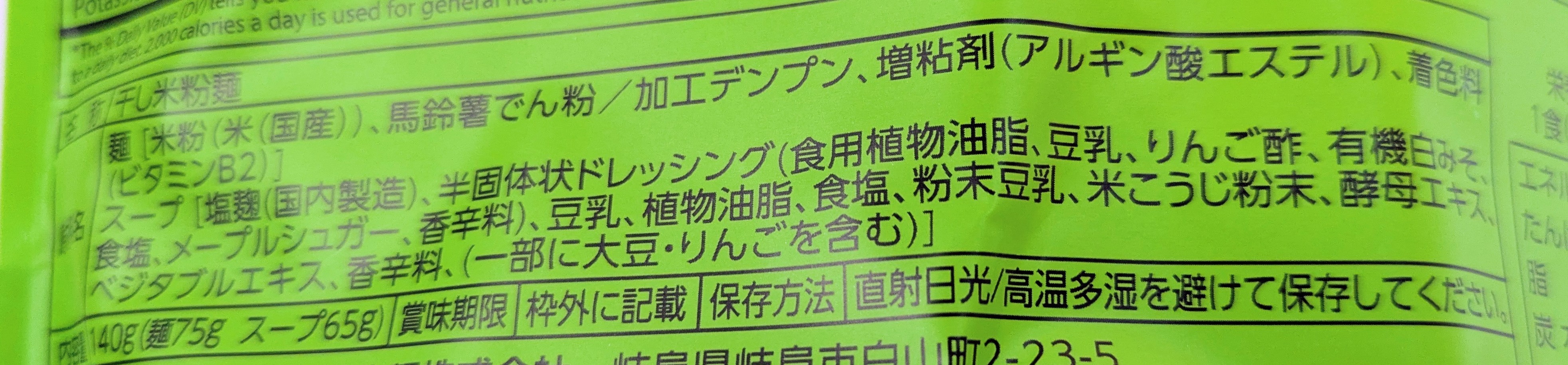 スープ: 塩麹、半固体状ドレッシング(食用植物油脂、豆乳、りんご酢、有機白みそ、食塩、メープルシュガー、香辛料)、豆乳、植物油脂、食塩、粉末豆乳、米こうじ粉末、酵母エキス、ベジタブルエキス、香辛料、(一部に大豆・りんごを含む)