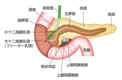 頭部の一部は鉤(かぎ)状に突出しており(鉤状突起)、この部分は「(膵)鉤(こう)部」と呼ばれます。膵頭部から膵鉤部には十二指腸が、膵尾部には脾臓が隣接しています。